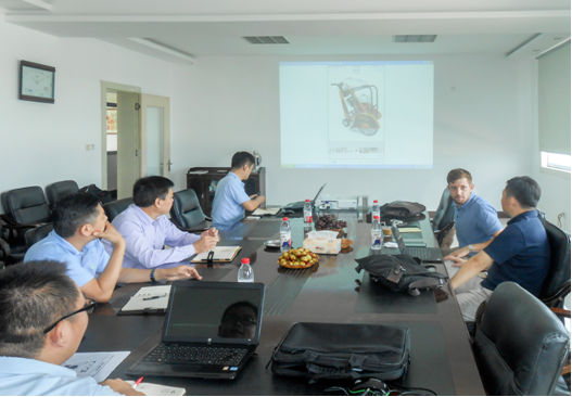 本次来访的美国TOMAK公司Mr.Larry首先参观了生产现场和产品展室,通过视频资料了解已开展的TPC80 平板夯项目生产情况,VB-38振平尺改进情况、整平尺发动机烧机油问题的解决方案和预防措施,并重点关注了公司生产的小型压路机项目。